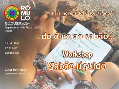 No próximo dia 4 de Abril, pelas 17h30, realiza-se no Rómulo - Centro Ciência Viva da Universidade de Coimbra, o Workshop "Sabão Líquido" onde César Henriques, Químico da EcoXperience nos vem ensinar a fazer, de forma segura e sustentável, sabão líquido (a partir de óleo alimentar usado).