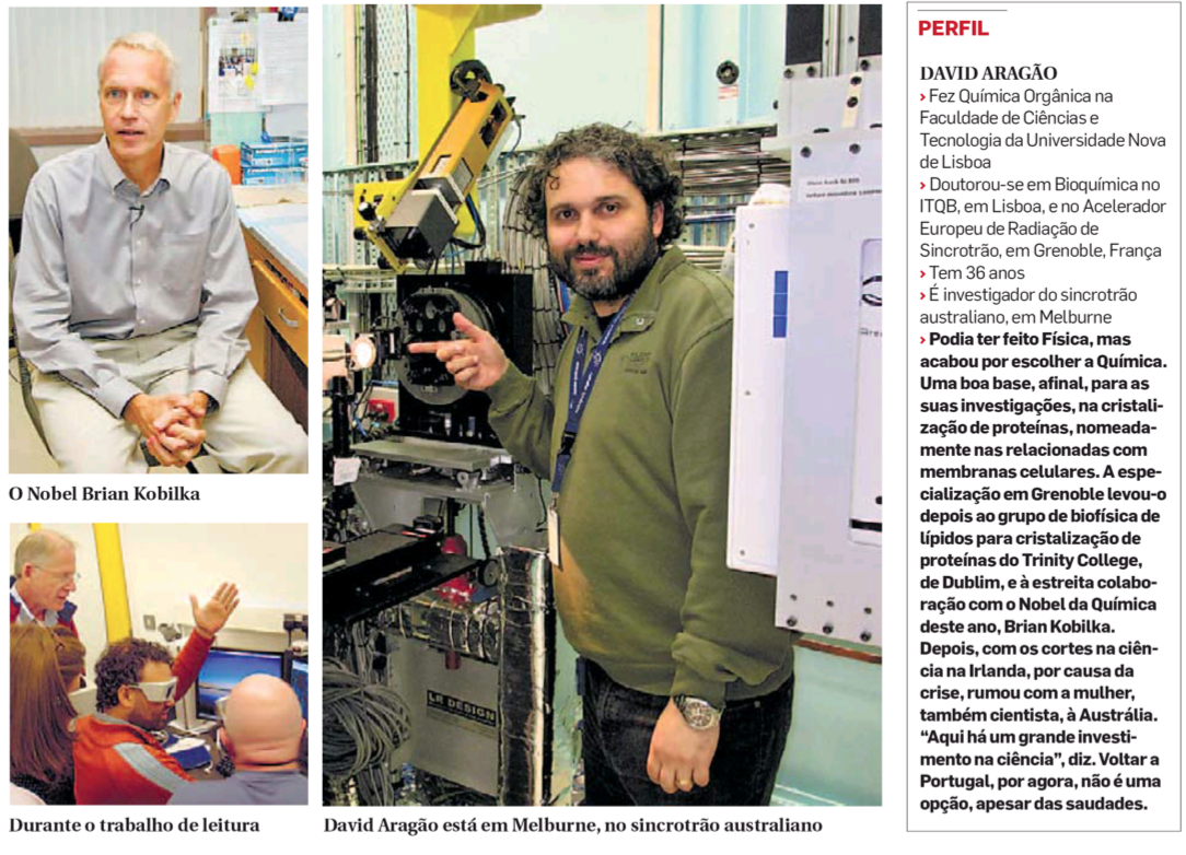 Atualmente investigador no Australian Synchrotron, em Melburne, David Aragão tem uma história em comum com Brian Kobilka. O jovem português trabalhou de perto com o novo Nobel da Química durante dois anos, e em janeiro de 2011, foi um dos coautores do artigo publicado na revista Nature que o comité Nobel considerou a “cereja no topo do bolo” do trabalho realizado pelo cientista norte- americano na busca dos recetores acoplados à proteína G, como são designados estes recetores celulares, que estão na base de algumas funções básicas do organismo e cuja descodificação foi o motivo do Nobel.