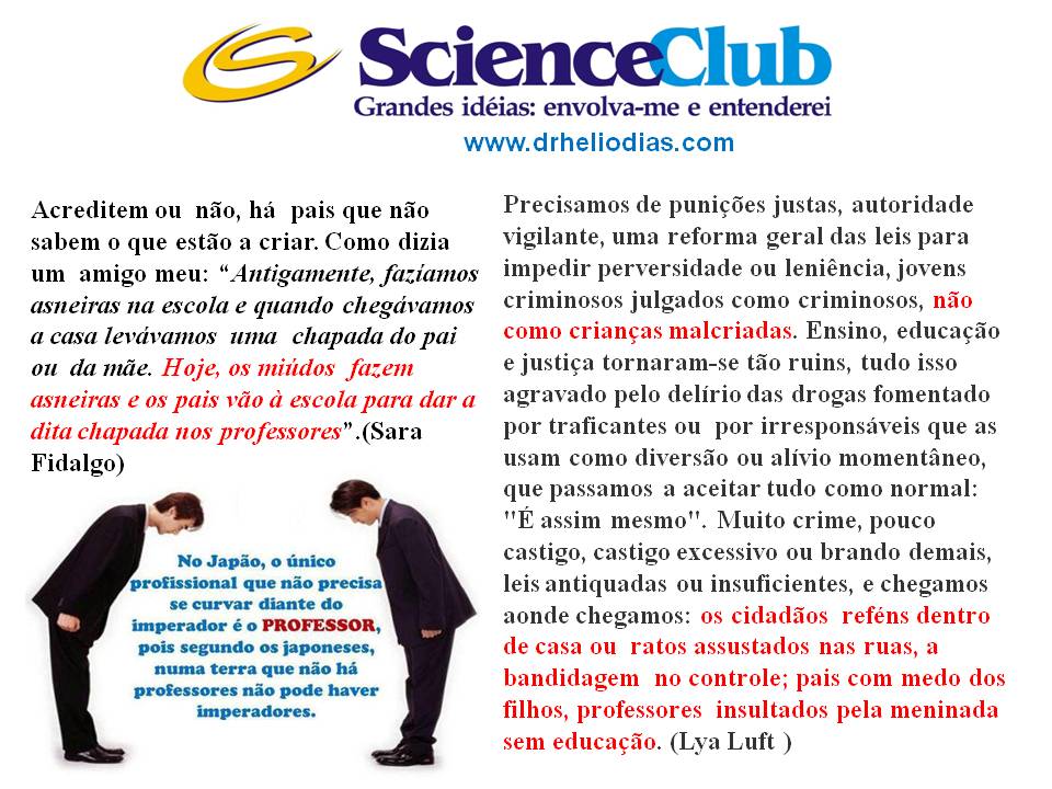 Antigamente, havia as escolas C+S; hoje, caminhamos para o modelo de escola S/M. Havia os professores sádicos, que espancavam alunos; agora o há os professores masoquistas, que são espancados por eles. Tomando sempre novas qualidades, este mundo.