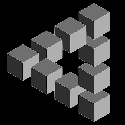 Permitam-me que explique melhor o meu ponto de vista regressando à minha metáfora favorita, embora tenha de vos pedir de novo que não a tomem demasiado à letra. O triângulo impossível, a que chamei o triângulo de Penrose no capítulo 1, foi descoberto pelo artista sueco Oscar Reutersvärd em 1934, quando, aos dezoito anos, fazia garatujas na margem de um manual durante uma aula de latim. Começou por desenhar uma estrela perfeita de seis pontas, depois começou a acrescentar-lhe cubos, colocando-os à volta da estrela, encaixados nos espaços entre as pontas. Enquanto prosseguia com o desenho, apercebeu-se de que, por casualidade, tinha criado um novo tipo de objecto extraordinário.