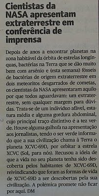 Aliás, não sabemos sequer se o Journal of Cosmology estará a operar na clandestinidade (ironia, claro), pois foi o próprio que anunciou a sua morte (a 14 de Fevereiro deste ano), atribuindo culpas irracionais e conspirativas à NASA. Será o último e estrondoso fôlego antes do fim anunciado? A própria linha editorial do seu "editor-chefe" é também posta em causa por David Dobbs aqui.